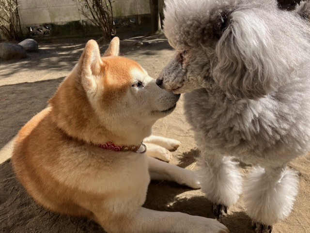 旧知の仲の柴姉さんとトイプーちゃん。小さい頃からの出会いで、絆もしっかり深く結ばれているみたい。
