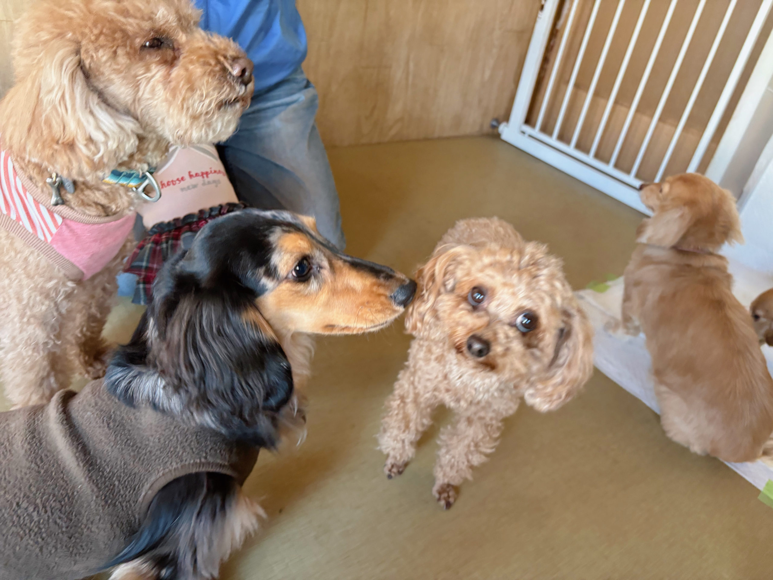 控え目さんなチワワちゃんに、優しくクンクン話しかけていたダックスちゃん。トイプーちゃん、