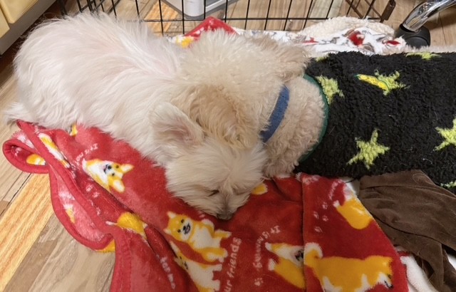 ベテラントイプーちゃんと長期滞在中のミックスちゃん、しろしろコンビさんでくっついてお昼寝中。