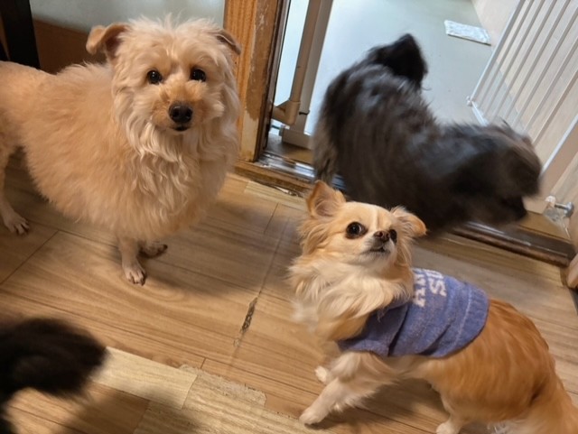 先輩のミックスちゃんが、新入りチワワちゃんにごあいさつ中でした。チワワちゃん、はじめての