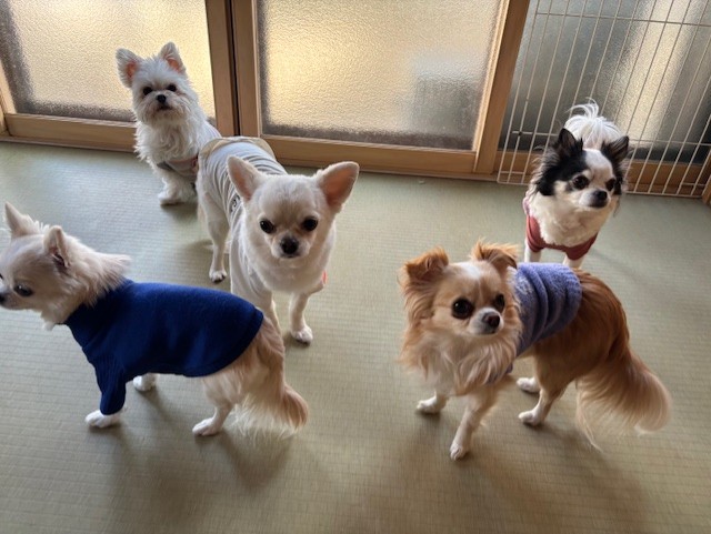 奇跡的にチワワちゃん4頭が何となく集合してくれたので、ミックスちゃんも交えて一枚いただきました。