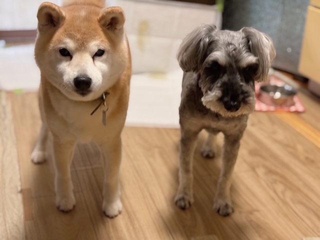 シニア柴さんとシュナちゃんが、ふたり同じポーズで佇んでおりました。その、なんとも言えない