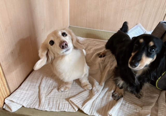 先輩ダックスちゃんのゆるゆるムードを感じながら、少しづつ慣れていってるところ。