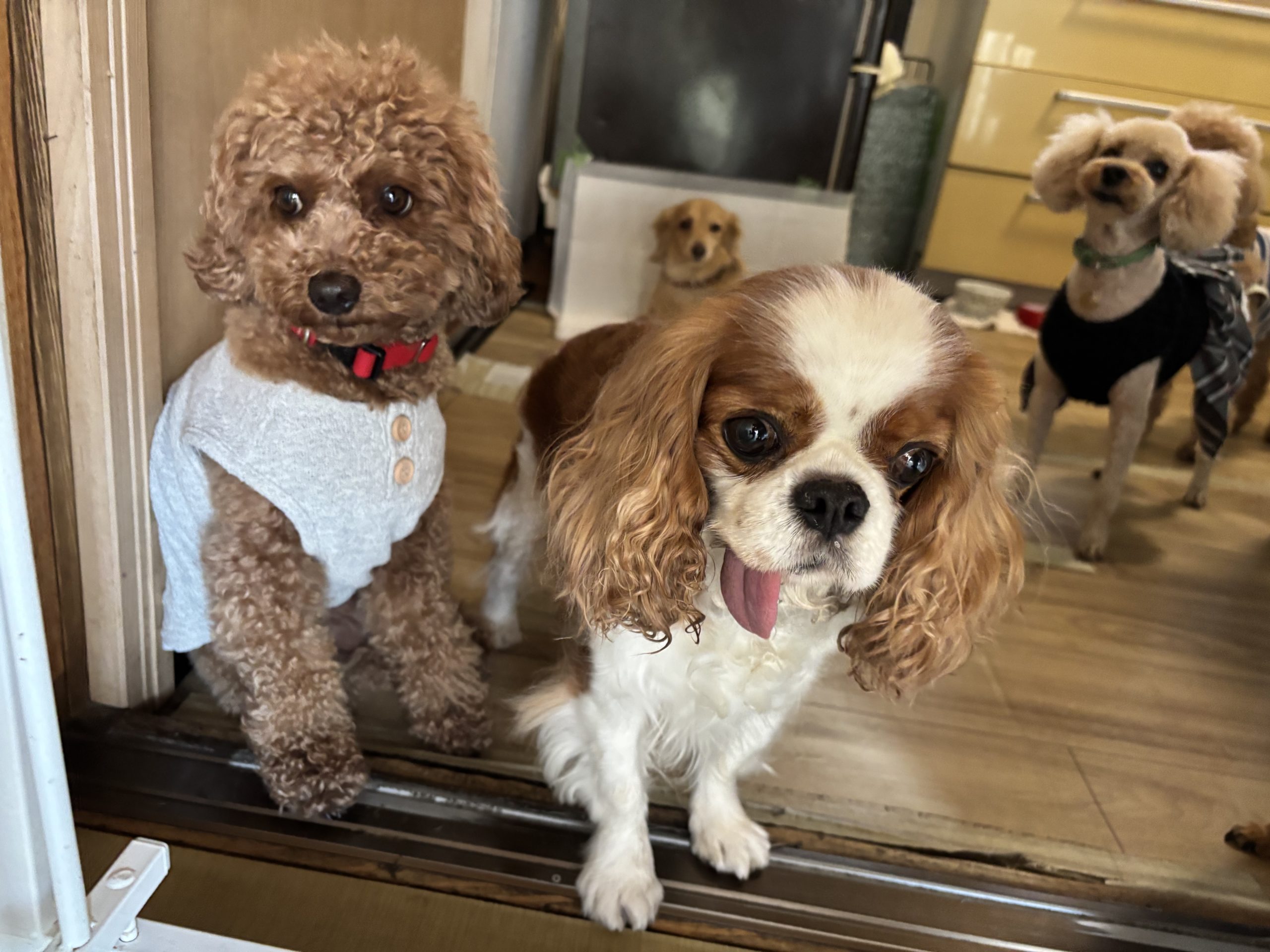 お泊まり組のキャバちゃんと、通いチームのトイプーちゃん、お部屋の境界線で何を思う…溢れそうな大きな瞳で、何を見つめるわけでもなく、でもお隣にいても別にいいよ、という緩やかなムードも。トコトコお部屋を何の気なしに歩く子もいたり、ばくぜんと佇む子もいたり、ベテランシニアさんたちはもちろんお昼寝に勤しんでいたり。皆さんそれぞれ思い思いの時間をのんびりと過ごす、ただいつもの日常ですが、ココロとカラダを落ち着かせてリズムを整えるためには必要なひとときでもあります。今朝はあいにくのザーザー雨が降って、お庭にも大きな池が出来ているので、まずはお部屋でゆっくり過ごすのが良いみたい、ゴロゴロしているだけでも、自然と親睦も深まっていきますからね(*^-^*)