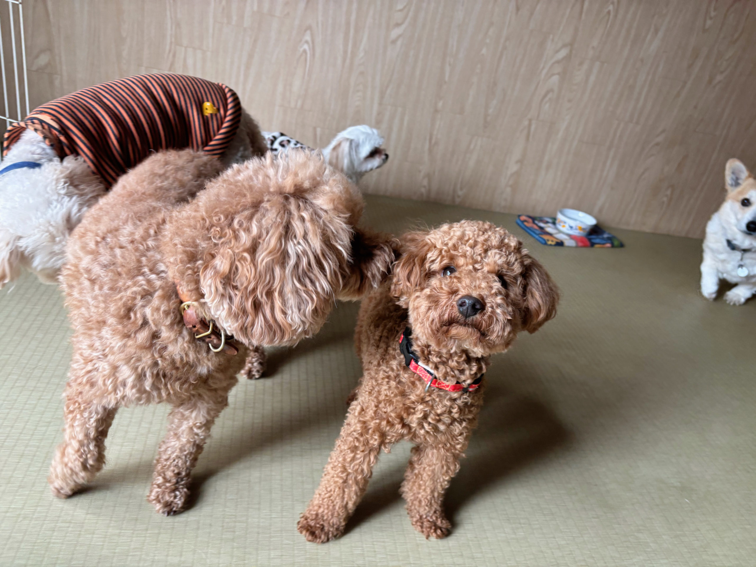 先輩トイプーさんが、後輩ちゃんにクンクン積極的あいさつを。先輩は、とてもおおらかで柔らかい