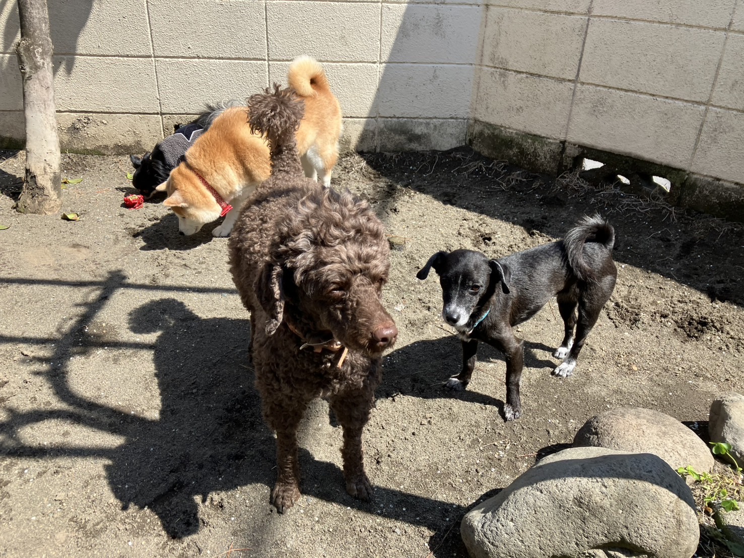 みんなで気ままにお庭散策タイム、ドゥードルちゃんとミックスちゃんも、全身にお日様の恵みを受けながら、