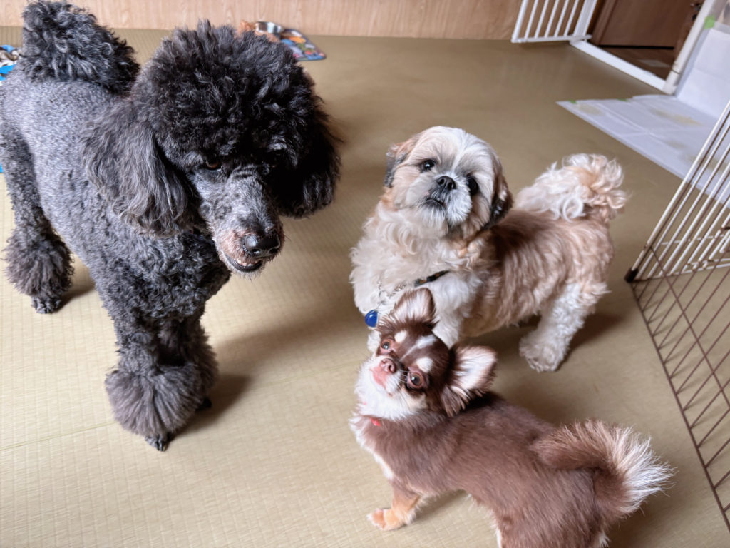 通いチームのプードルちゃんと、お泊まり組のシーズーちゃん&チワワちゃん、何やらお三方で集まって、