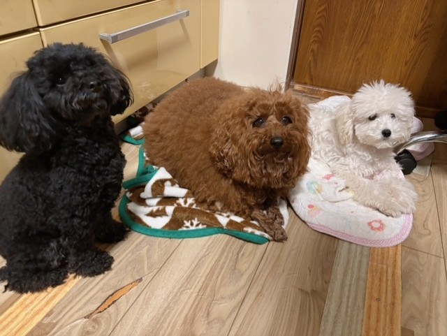 ブラック、レッド、ホワイトのトイプーさんお三方が、キレイに並んでお休みになっていたので、