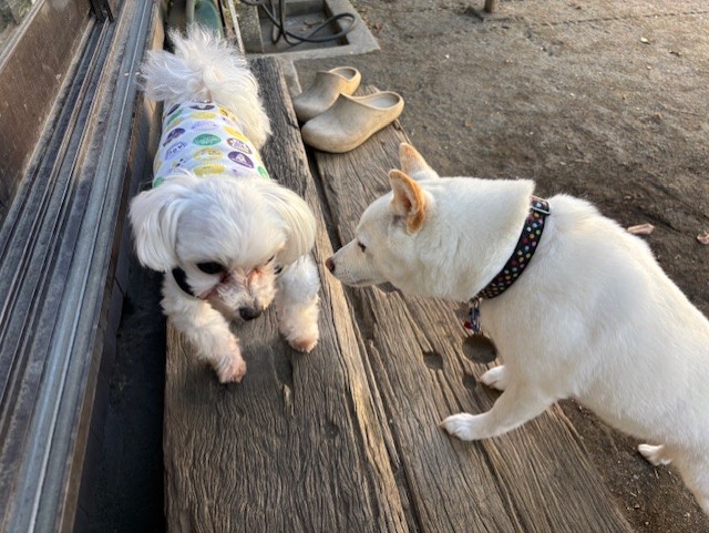 お庭散策を終えて、枕木ゾーンでちょっとお休憩していたマルチーズちゃんのところへ、新入りの