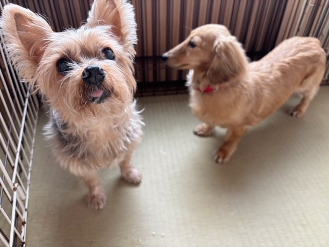 とっても大人しいダックスちゃんなので、ヨーキーさんも少し安心みたい。このあと、少しだけ