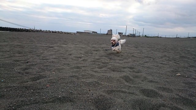 あれっ?海にウサギが・・・いえいえマルチーズくんが全力疾走中です。