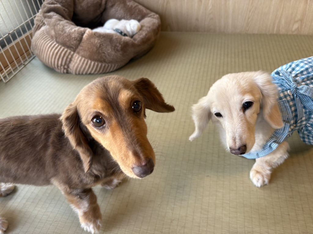 仲間たちとも交流。それが済むと、右の先輩ダックスちゃんは、うしろの茶色ベッドへ、マルチーズちゃんのお隣にちょこんと収まり、左の子も違うお布団に上手にくるまってお休憩タイムへ。