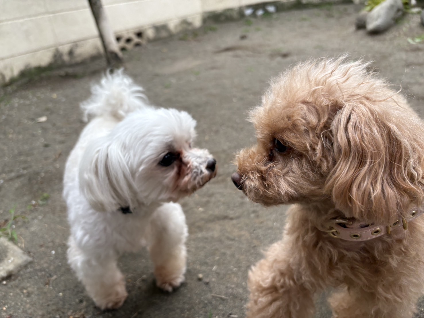 お庭で、小さい方たちが静かにお話ししていました。散策途中にちょこっとお話しして、お互いのチェックもしたら、またそれぞれトコトコ可愛く歩きだし、気ままに散策再開。