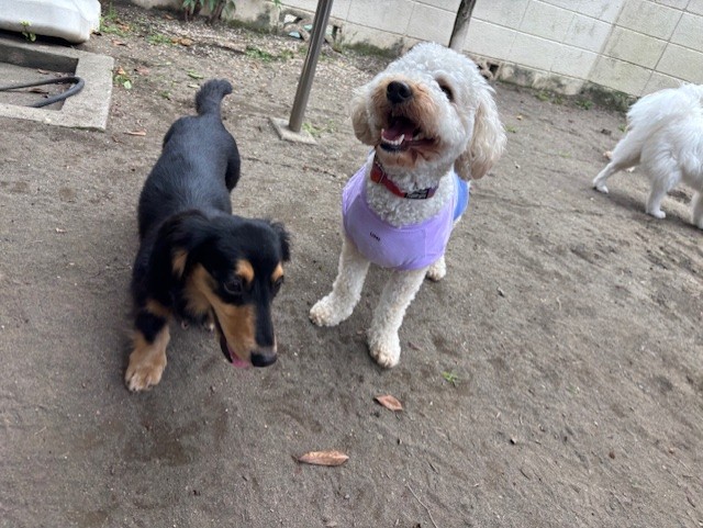 元気ハツラツで今日もお庭をみんなで散策。ダックスちゃんも、ミックスちゃんも、お庭へ出ると一気に遊びスイッチが入るようで、躍動感たっぷりに歩いたり走ったり。時々、通りすがりに