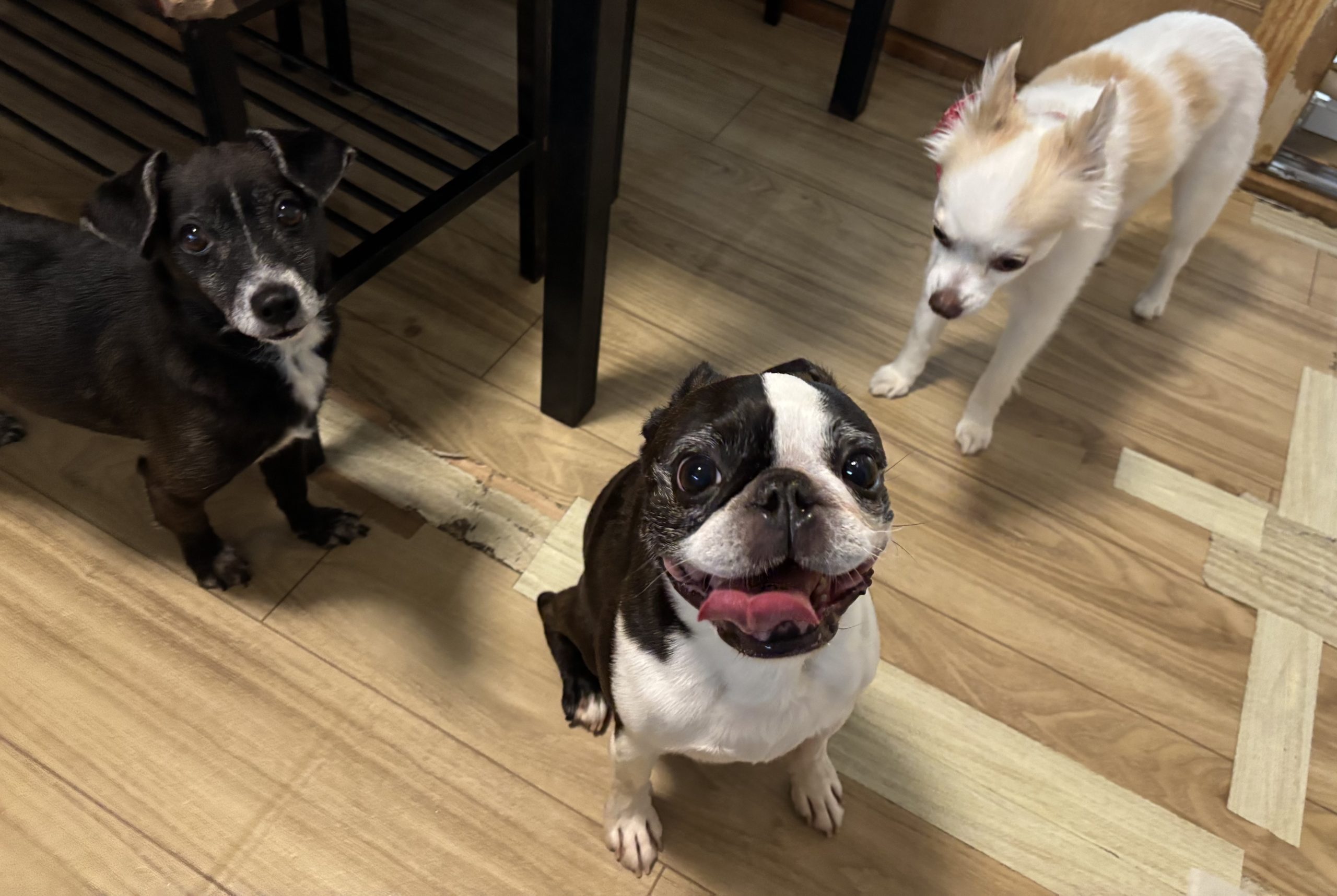 少しお久しぶりに来てくれたボストンちゃん、お耳は全部うしろに、口角はグイッと上がって、トレードマークの大きなおめめは、今にもこぼれ落ちそうなくらい。ついでに立派でキレイなピンクのベロを揺らしながら、人間にアピールしております。