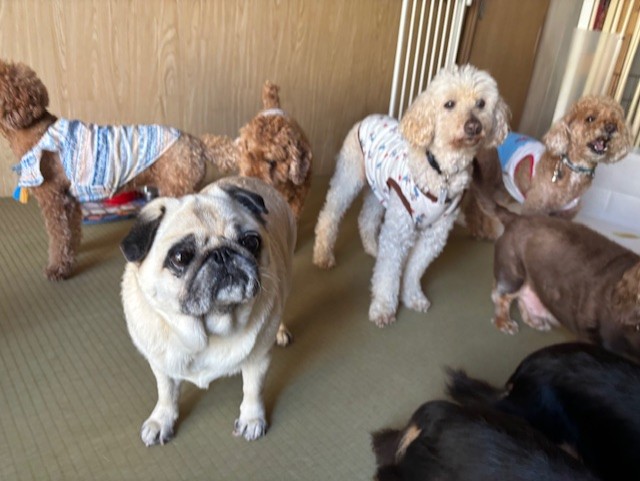 お久しぶりに来てくれたパグちゃん、顔なじみさんやはじめましての子たちとごあいさつ中。