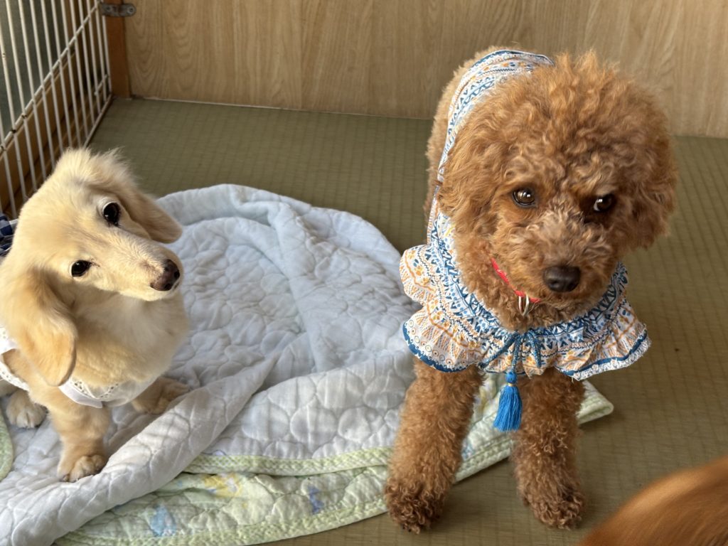 通いチームのベテランお嬢様たち、一通りいつものごあいさつもしたところで、あとはお昼寝休憩をするご予定みたい。毎回お洋服もとってもお似合いで、季節感を運んできてくれるファッションリーダーでもあります。