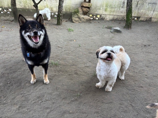 超マイペースな柴さんとシーズーちゃんも、軽い足取りで元気に歩き回り、時々通りすがりに
