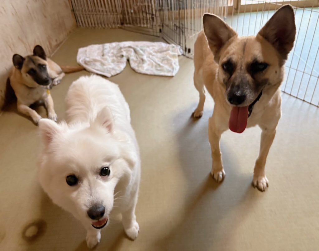 スピッツちゃんのお兄ちゃんは、後ろでくつろいでいるミックスちゃん、そして、お隣にいるのはルームメイトのミックスお姉さん。ミックスちゃんたちがとても似ている雰囲気なので、スピッツちゃんもすぐに安心できたみたい。この後も、和やかにクンクンし合ったりお話ししたりと、穏やかな時間を一緒に過ごしていました。