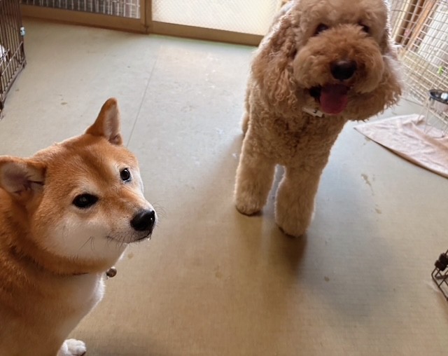 穏やか組の柴ちゃんとドゥードルちゃん、クンクン匂いの記憶を探りながら、落ち着いて