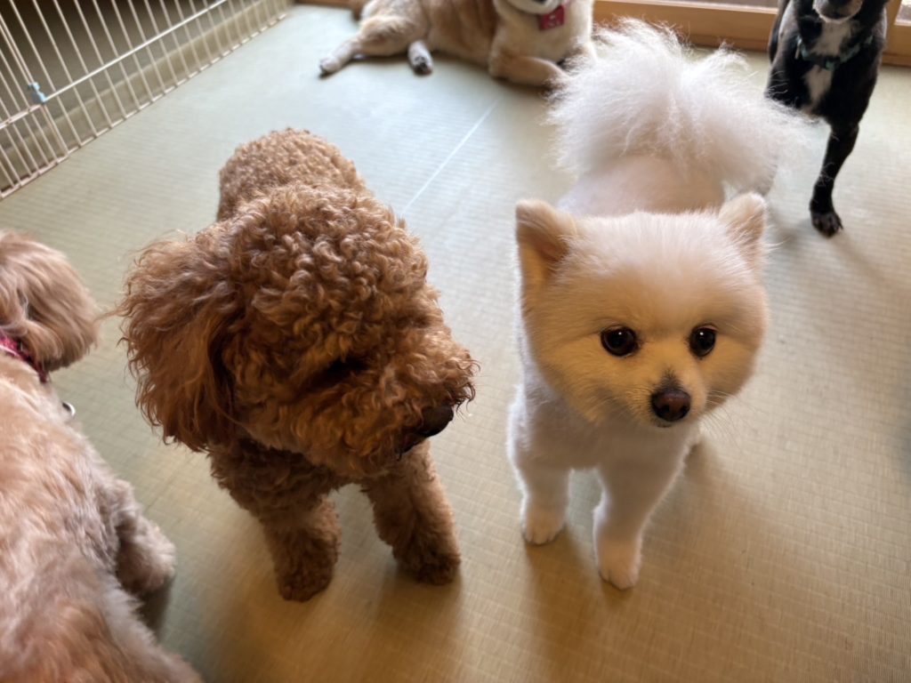 ベテランポメちゃんがキュートにリポート、そこへトコトコと後輩のトイプーちゃんも