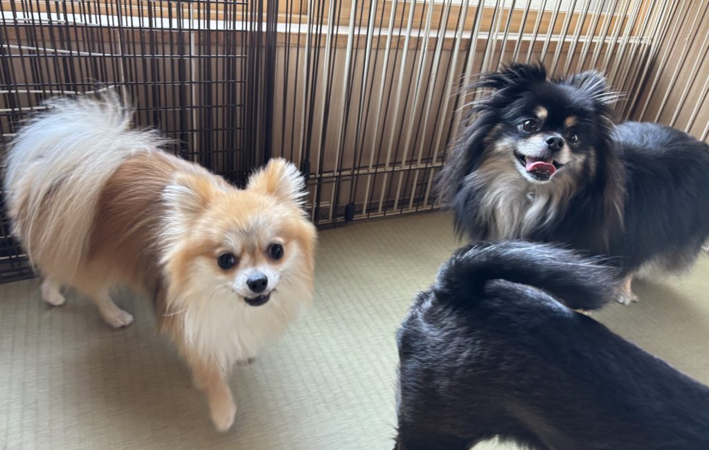 天真爛漫ポメちゃんと、マイペースチワワ先輩。お二人とも立派なフサフサのシッポがトレードマークで、サラツヤの被毛もとてもお美しい。性格はほぼ真逆、と言っても良いかもしれませんが(笑)無事ごあいさつも出来て、和やかムードです。