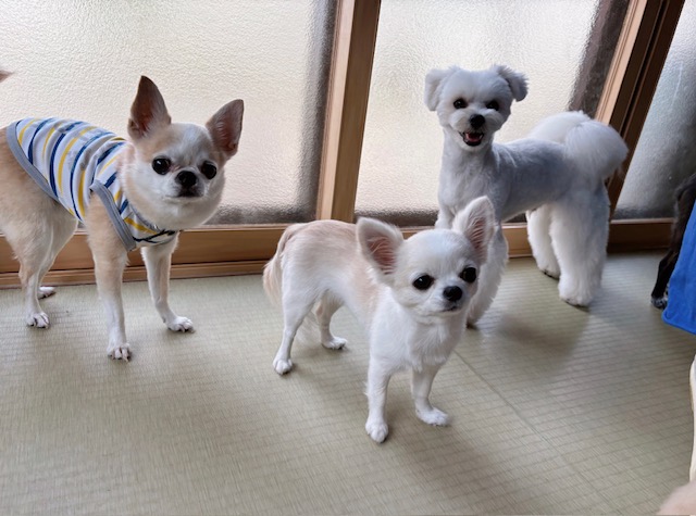 同じ系統のチワワちゃんと、三兄弟のミックスちゃん。シロ白さんたちがちょうど