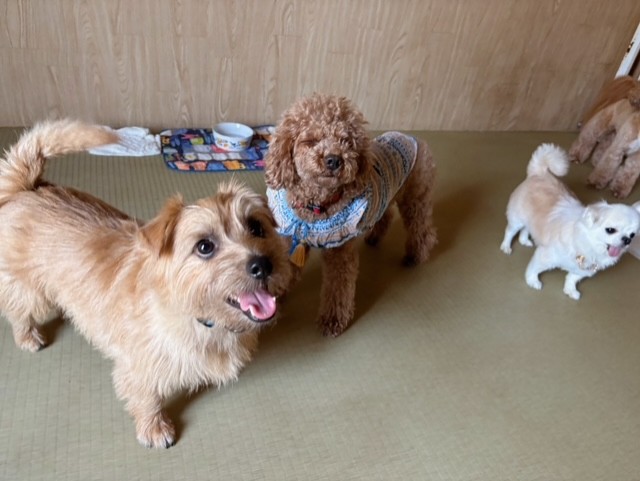 テリアちゃんは、来る子来る子に興味津々で、先輩でもはじめましての子でも、積極的ごあいさつを(笑)先輩トイプーちゃん、最初はちょっと戸惑い気味でしたが、クンクンごあいさつをしたら、その天真爛漫さが伝わったようで、無事コミュニケーションも取れ、安心確認もできたみたい。