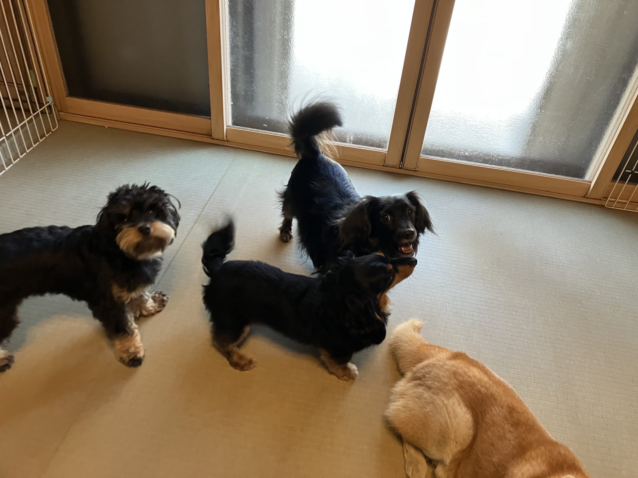 遊び好きなヤングチームの子たち、ダックスちゃんがしきりにミックスちゃんに遊びを