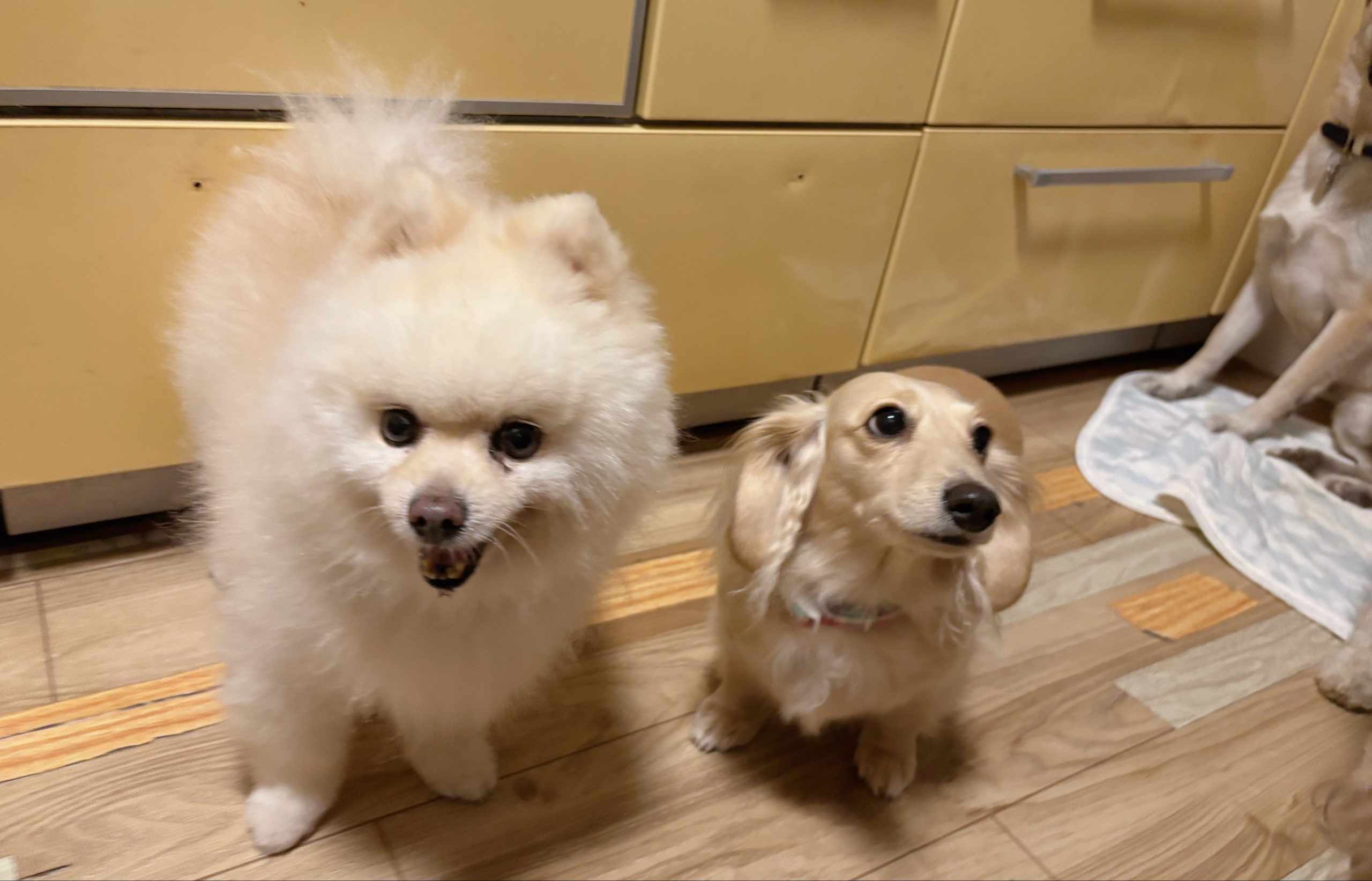 超がつくほどマイペースさんなポメちゃんとダックスちゃん。お部屋のあっち側では、今日もはしゃぎチームが運動会をしていて、おふたりはそんな光景を遠目から眺めている、というわけです。