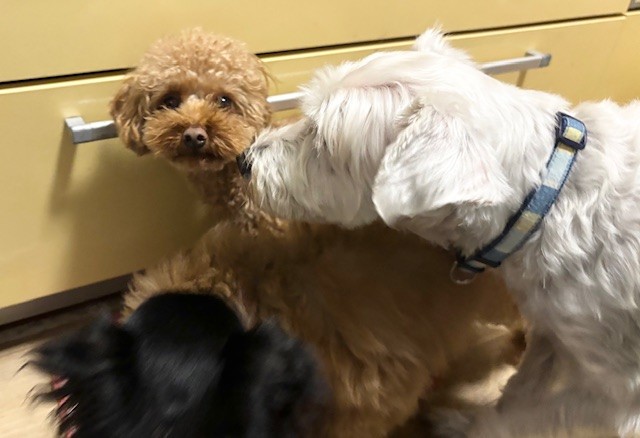 ちょっぴりお久しぶりに来てくれたトイプーちゃん、まずはルームメイトたちのクンクンチェック