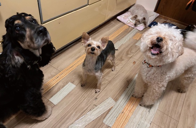 可愛く見上げるお三方、数日間一緒にお泊りだったので、すっかりリラックスムードで
