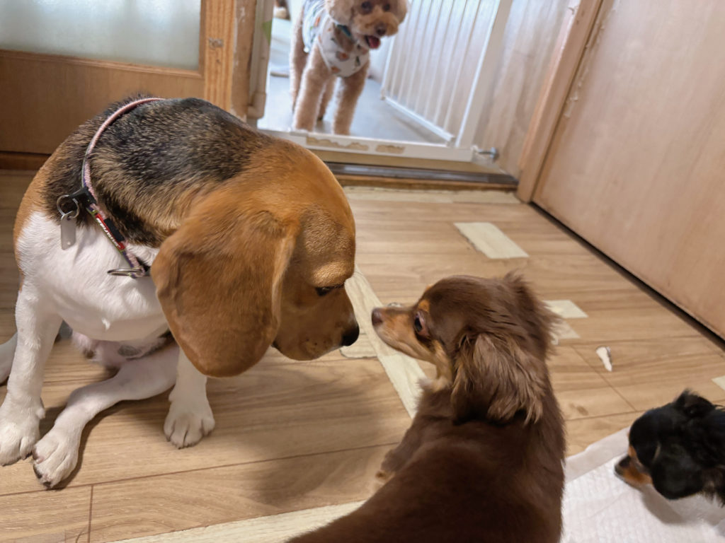 最近仲間入りしてくれたミックスちゃん、先輩のビーグルちゃんとクンクンごあいさつ中。初めての滞在なので、最初はちょっぴり緊張もしていたようですが、だんだんと場に慣れてくると他の子たちとも交流できるようになりました。