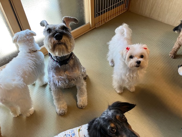 ベテランシュナちゃんと、新入りのマルチーズちゃん。おふたりキュートに並んで