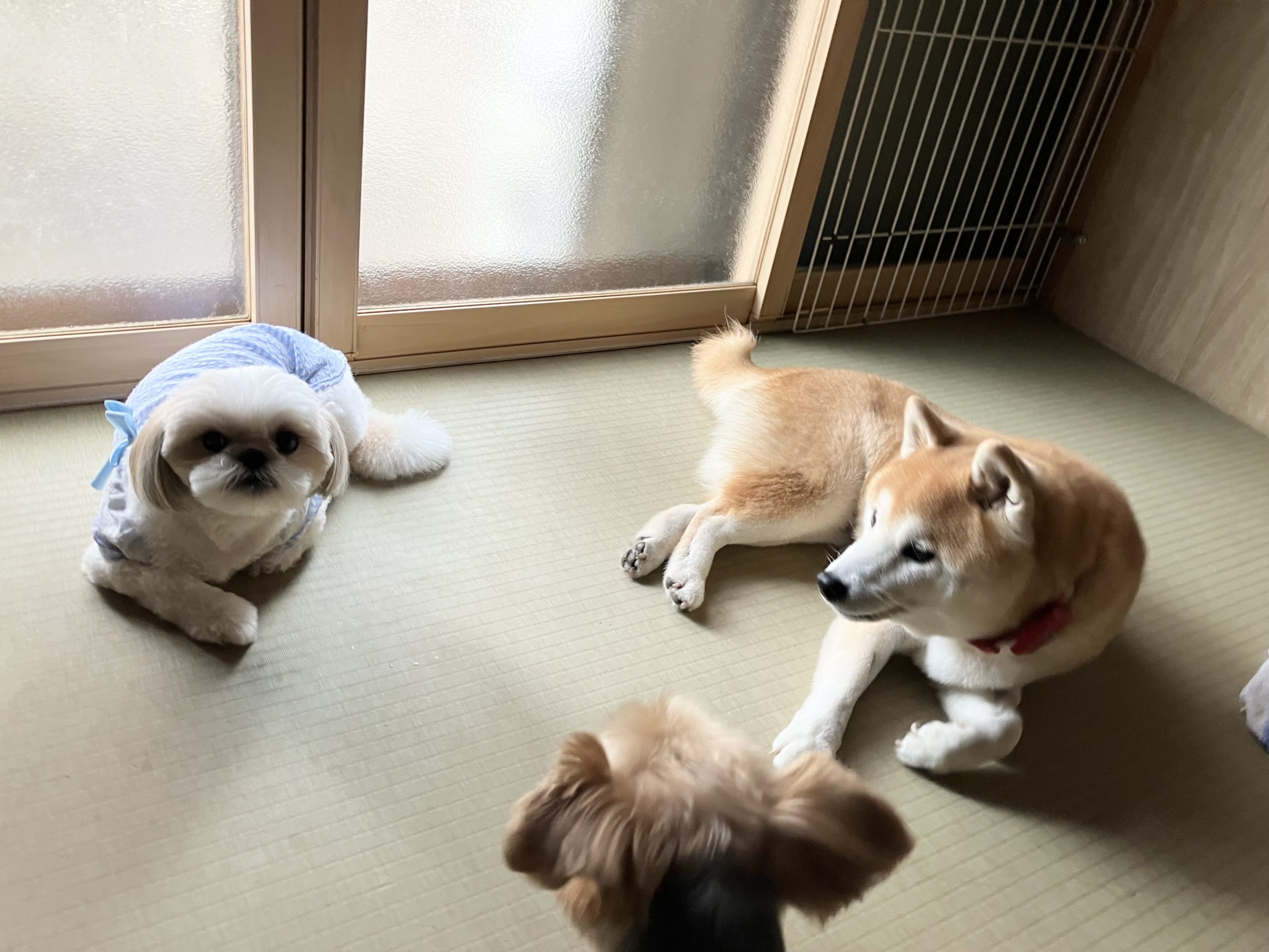 おっとりシーズーお嬢様、みんなとの顔合わせも一通り済んだので、ここらでひとつお休憩タイムを。柴姉さんの横にちょこんと伏せてくつろぐ光景が、何とも言われず微笑ましくて、ベテランさんたちならではの柔らかな雰囲気が、じんわりと伝わってくるようです。
