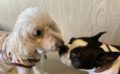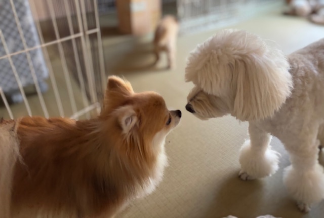 お泊りチームのポメちゃんと日帰り組のトイプーちゃんが、クンクンお話し中。