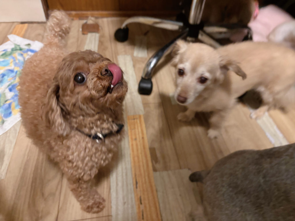 立派なペロをご披露してくれたトイプーちゃん、身体と首の角度も絶妙で、小ぶりで少しぽてっとした体型がとってもキュート。新入りさんなので、まだ少し戸惑いもあるようですが、人間にはちいちゃなシッポをぷりぷりさせながら甘えてくれます。人間に甘えられるようになると、少しずつ安心感も出てくるみたいで、時間を追うごとに身体の緊張もほぐれて、他の子たちともちょっぴりごあいさつも出来たり。何より無理せずゆっくり慣れることが大切ですからね。