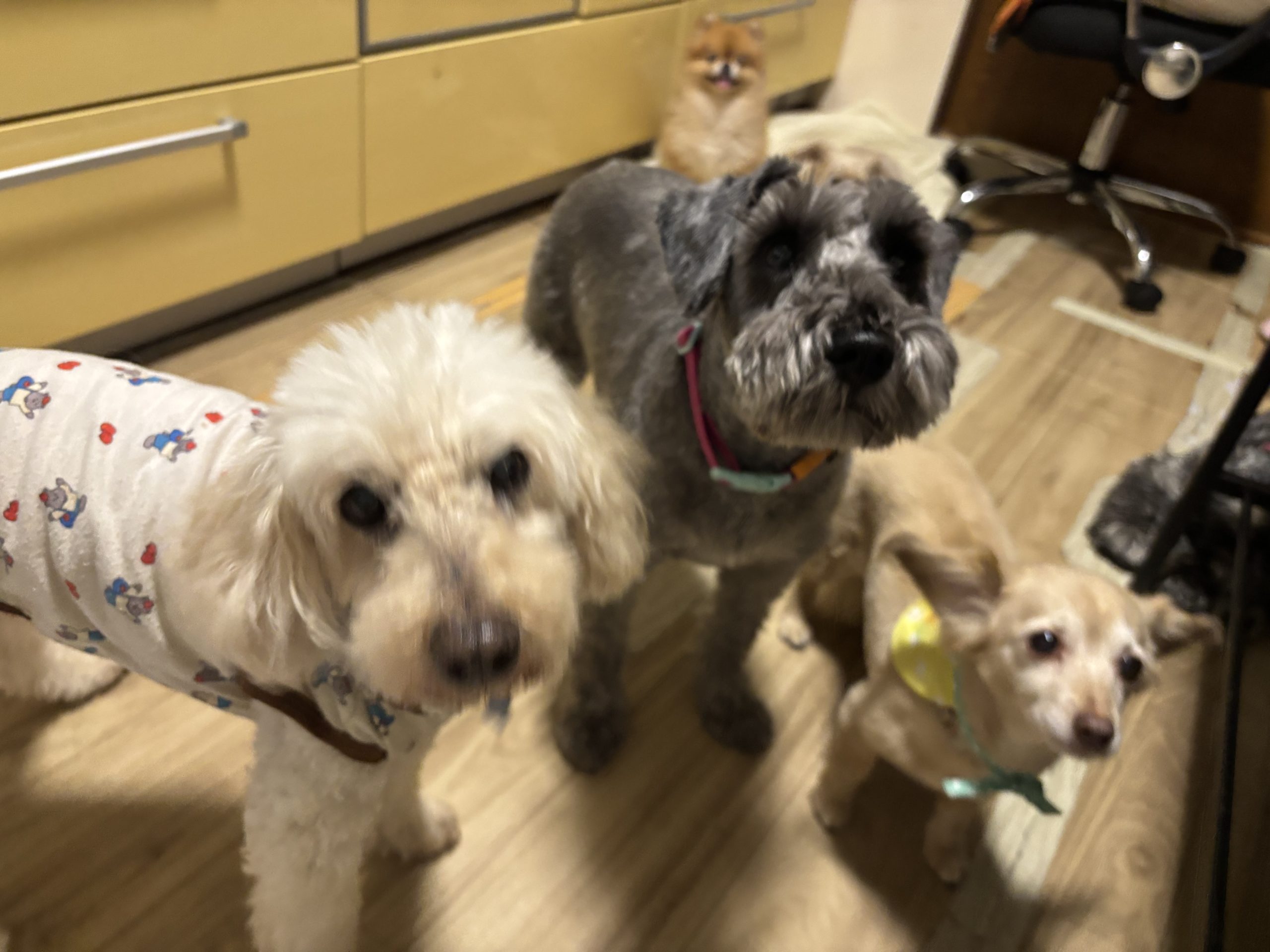お久しぶりの滞在のシュナさんと、ベテランシニアさんたちが穏やかにごあいさつを交わしていたところ。ちょっぴり怖がりのシュナさん、最初は戸惑いがありましたが、ベテランシニアさんたちや穏やか組の子たちとは、だんだんとごあいさつできるようになりました。こういう少しの交流がきっかけになって、安心モードに切り替わると、行動範囲も広がり、やがては他の子たちともコミュニケーションが取れるようになります。何事も、きっかけというのはやはり大事なんだなあ、とわんこたちの世界を見ていても実感しますね。