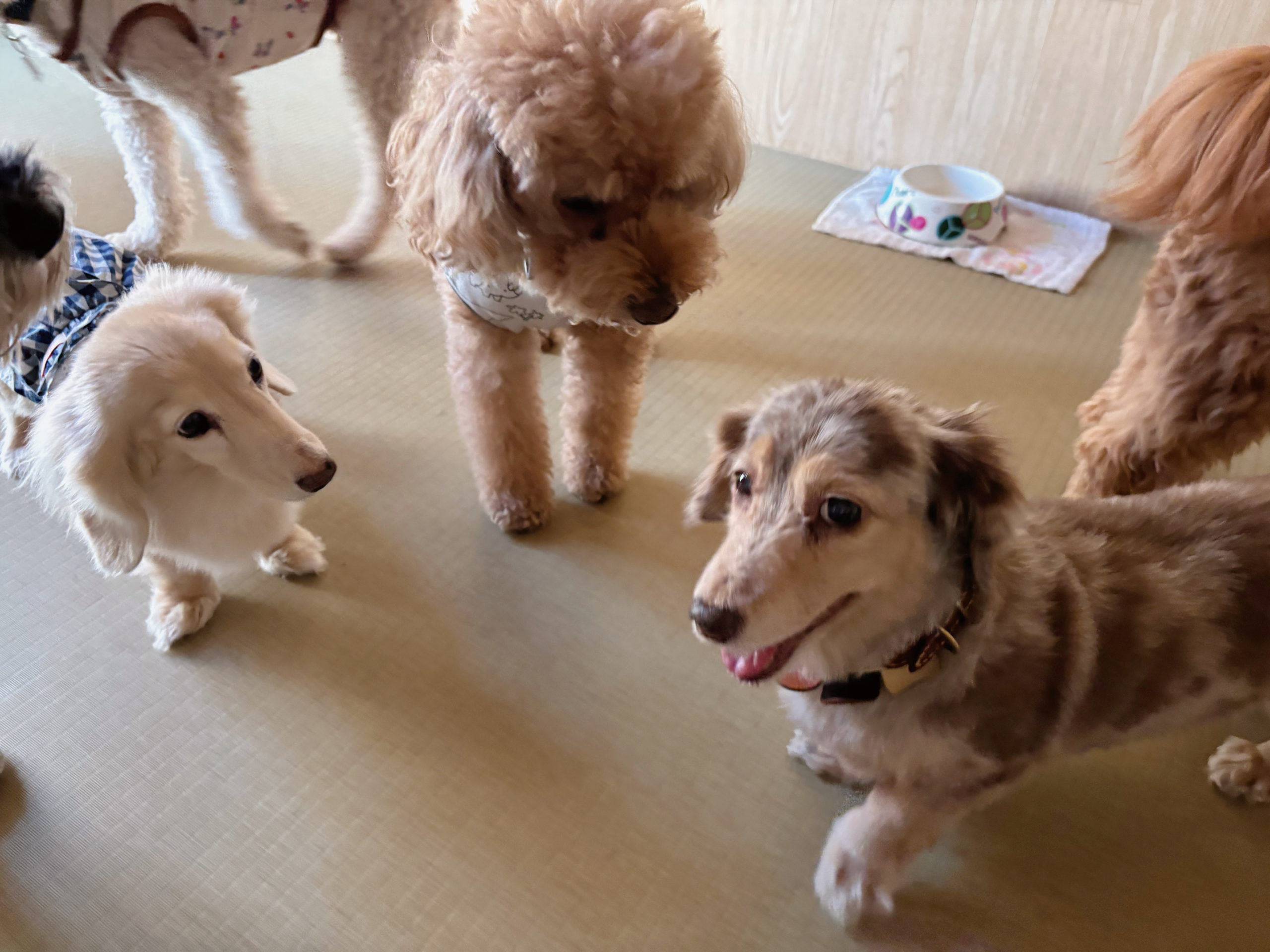 シニアダックスちゃんが、トコトコキュートに横切り中、先輩ベテランさんたちがそんな