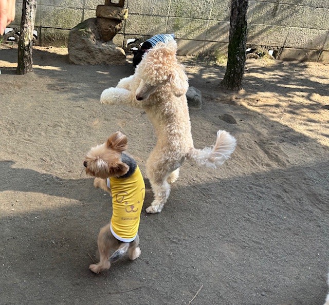 最初にトイプーちゃんが人間に甘えてぴょーんとしていたところ、お隣に来たヨーキーちゃんも