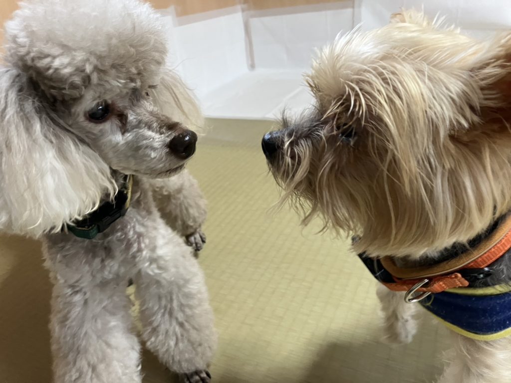 おっとりチームのトイプーちゃんとヨーキーちゃん、静かにクンクンお話し中です。