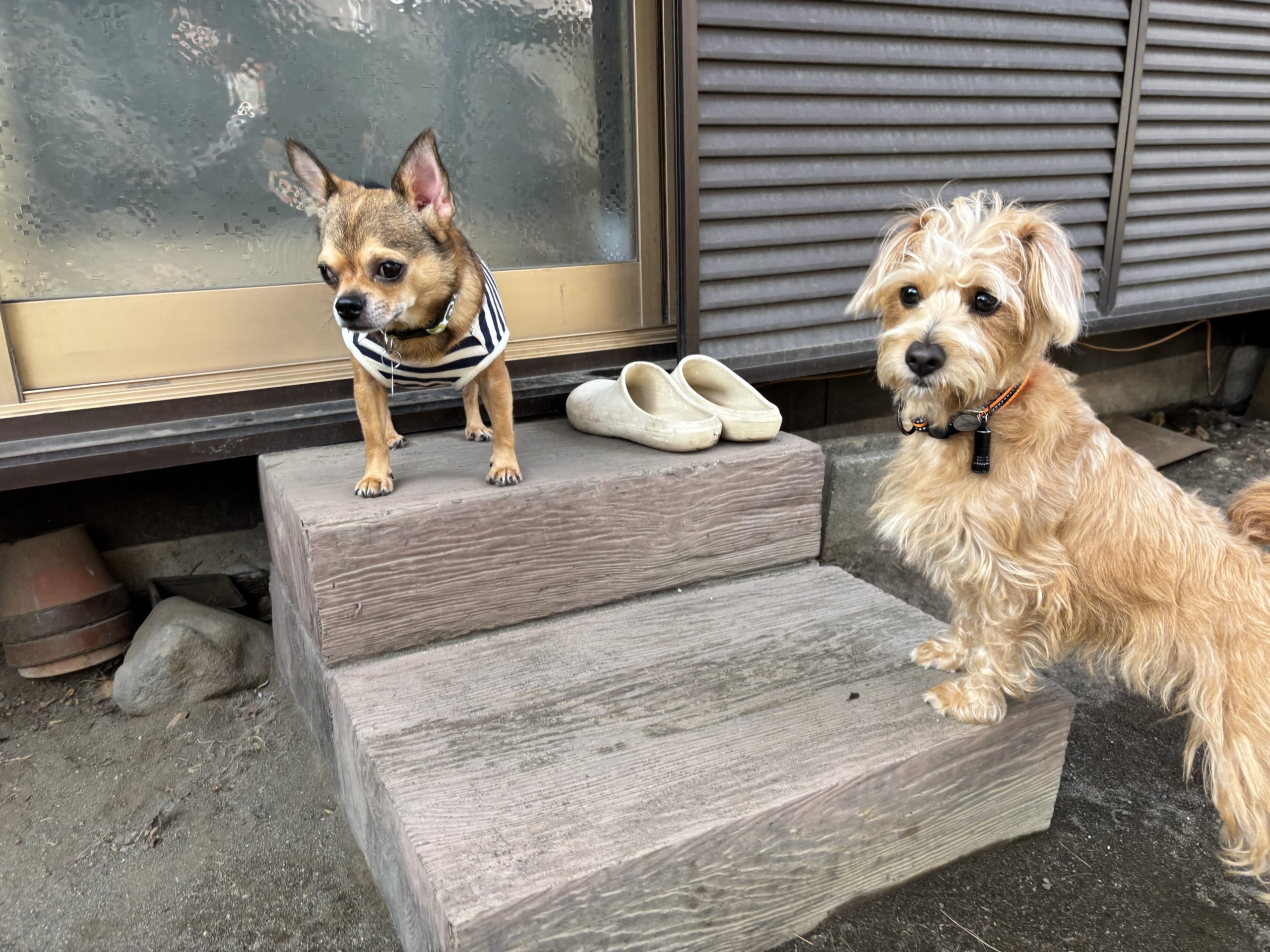ミックスちゃんがトコトコやってきて、一緒に何かを観察中。