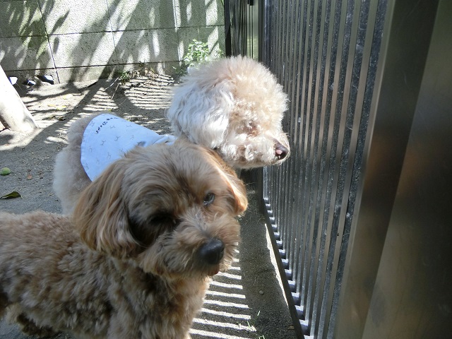 湘南のペットホテル、お散歩までの時間は、日陰のあるお庭でみんなとわいわい。