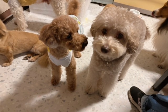 ベテラントイプーちゃんと新入りトイプーちゃん。新入りさんは先輩にクンクン、