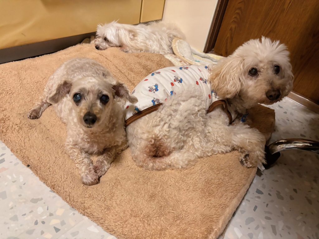 お布団ゾーンでは、シニアさんたちが思い思い、お休憩タイムを。後ろのマルチーズさんは