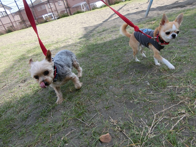 仲良く公園をお散歩中。まだ陽があるので、日陰を探して歩きます。