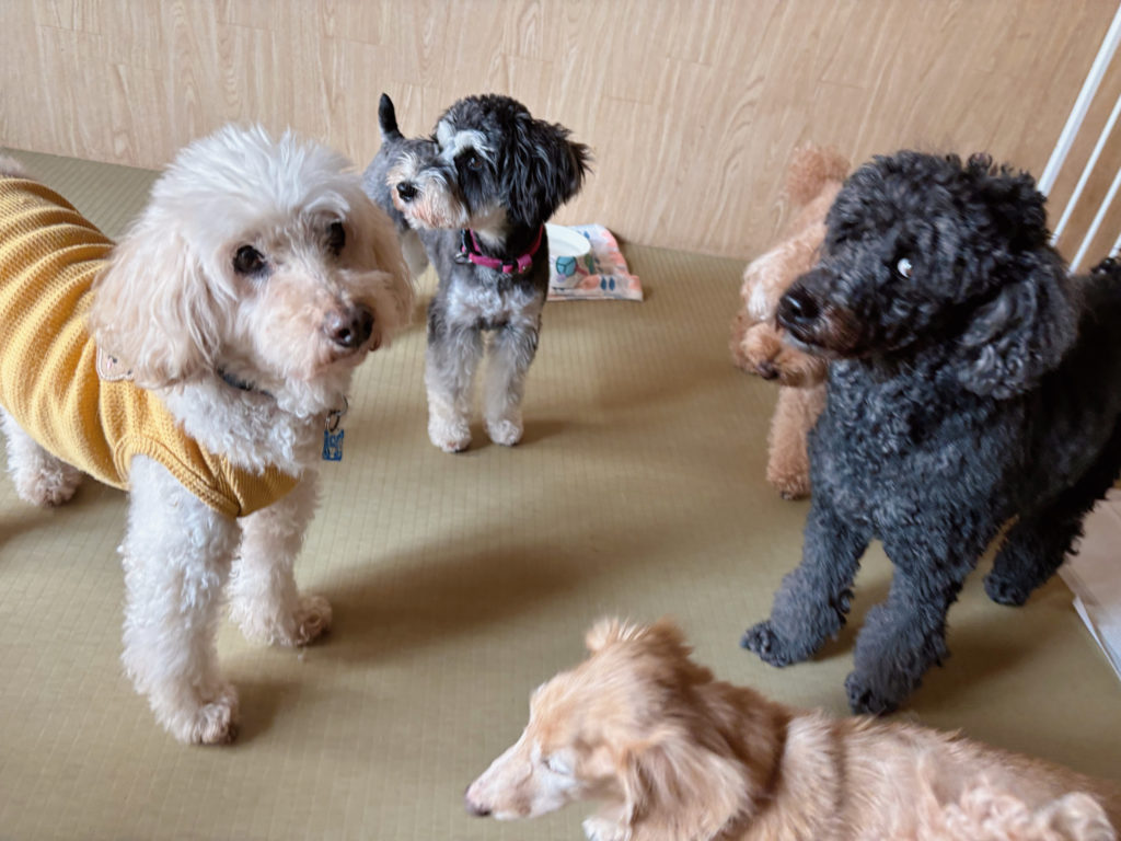 いつものごあいさつが終わると、好奇心旺盛な黒プードルちゃんは新しく会う子の所へ行って、積極的交流を、ベテランさんはトコトコとまた自分の持ち場へ戻り、お休憩。