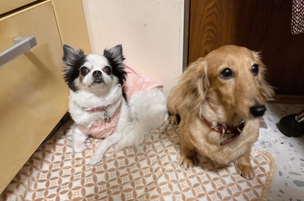 その横にちょこんと座る、同じくマイペース型のダックスお嬢さんは、みんなの様子を遠目に