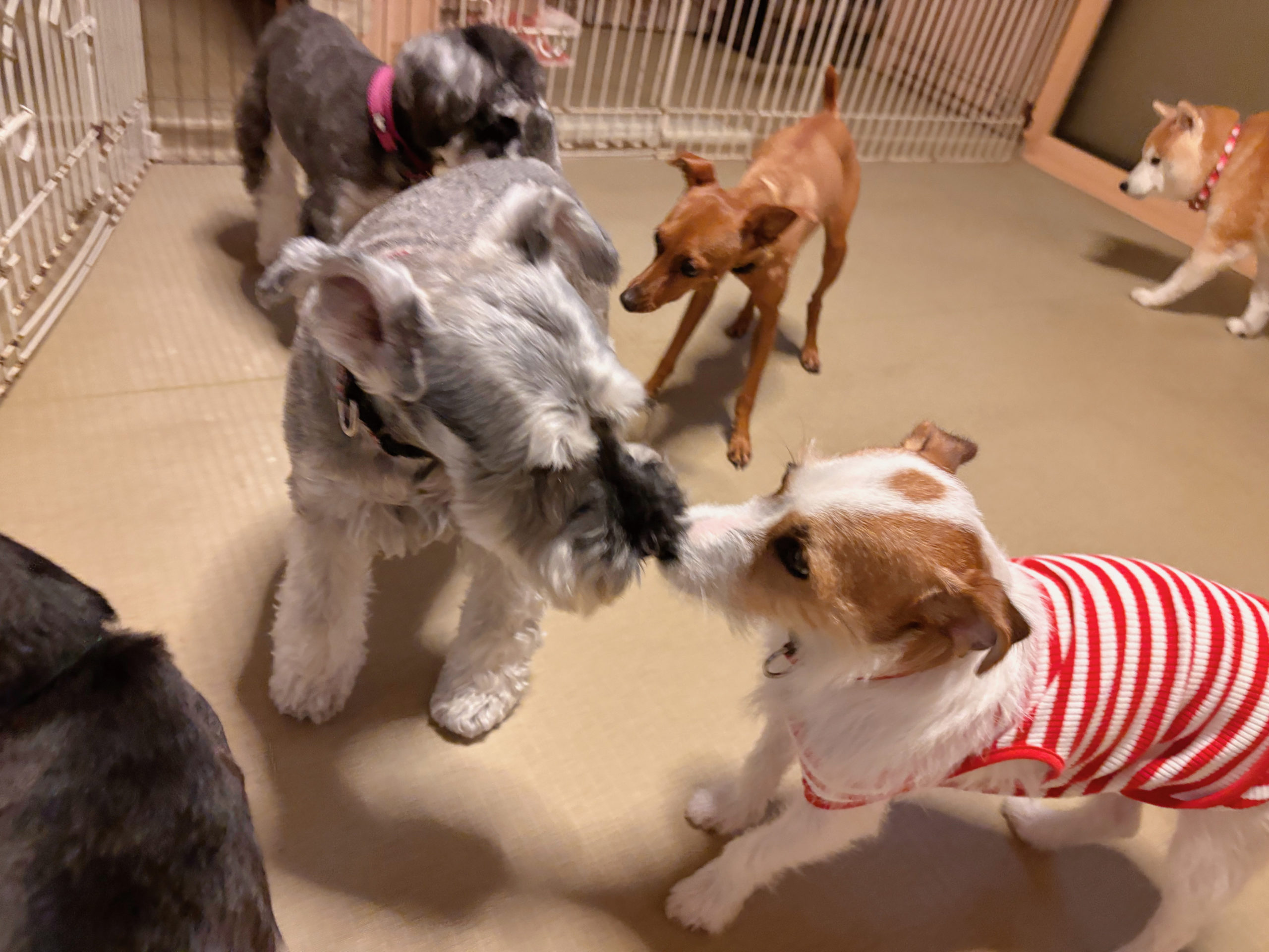 先輩シュナさんにごあいさつ中のジャックちゃん。クンクンクン、お鼻をくっつけ上手にお互い確認、いろんな情報交換もしています。