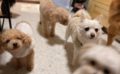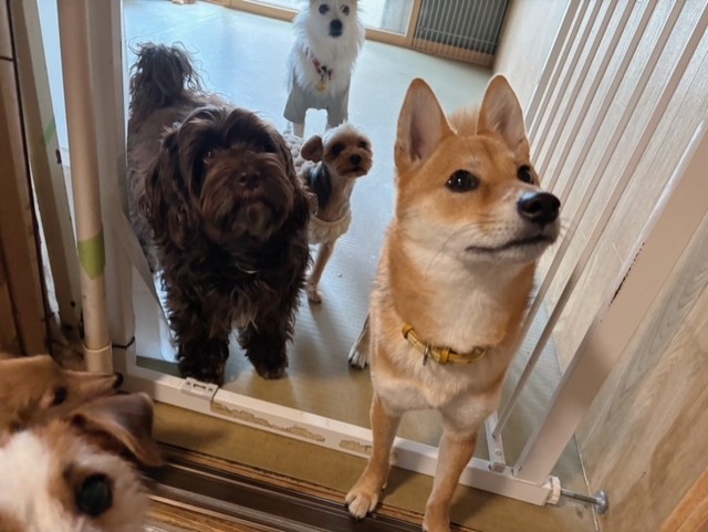 柴さんとドゥードルちゃんが、ちょっと真剣な表情、その後ろにいるヨーキーちゃんもミックスちゃんも同じく。いろんなセンサーが瞬時に働くわんこたち、お部屋の向こう側で何か音がしているのか